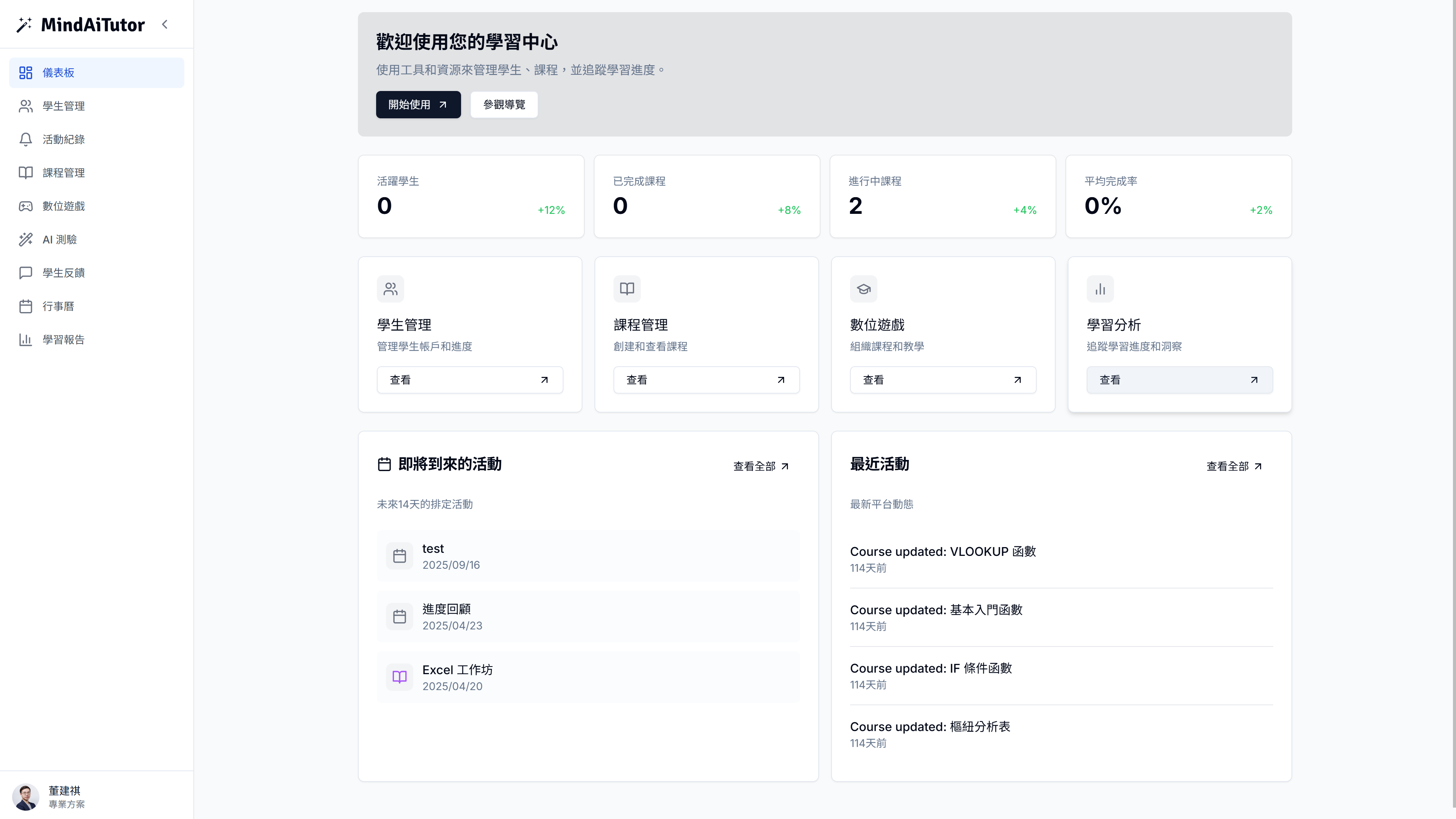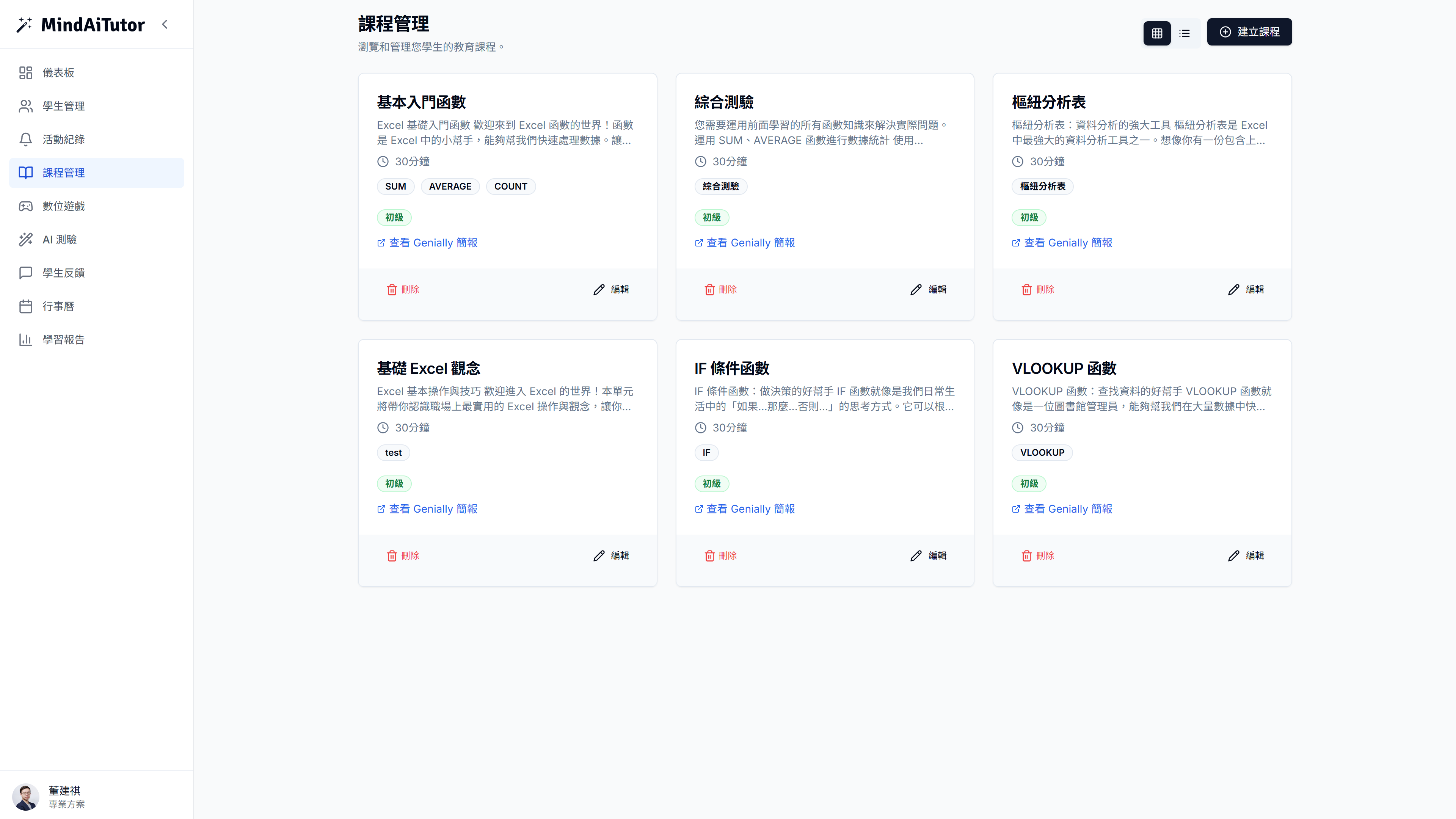 MindAiTutor (教師輔助平台) 問題痛點無論是企業內訓人資或學校教師,在教學過程中都缺乏有效的歷程追蹤與成效分析,難以掌握學習者的困難。此外,資源與時間的限制,需要讓教學者可以專注在產出優質教學內容,且有效追蹤學習者成效。解決方案專為教師設計的教學輔助平台,能有效監控學習狀況。平台提供班級儀表板與學生進度追蹤,並協助教師進行差異化教學。