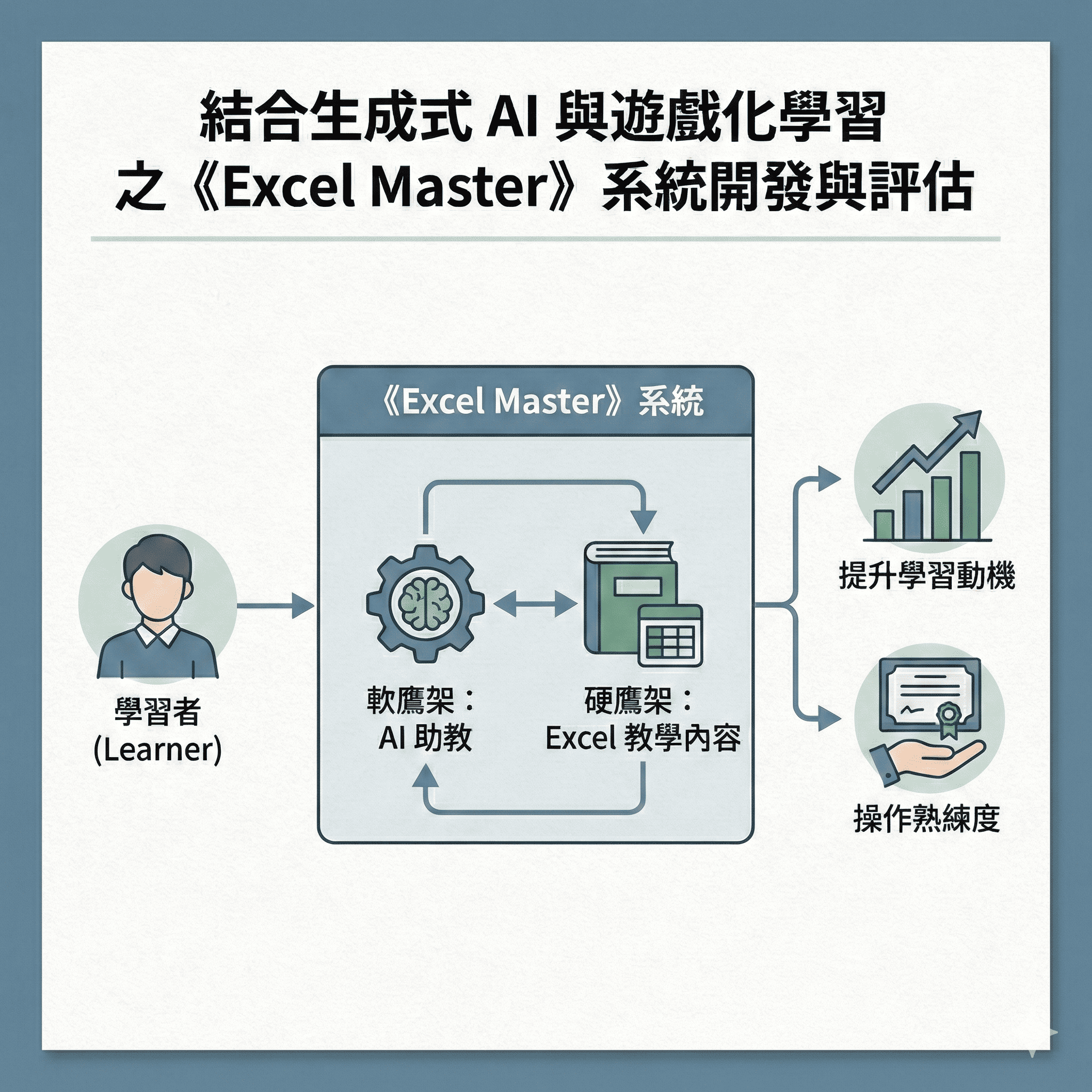 結合 AI 助教的鷹架式數位遊戲式學習系統:以 Excel 教育為例碩士論文針對大學生缺乏實用 Excel 技能的現況,本研究開發結合 生成式 AI(GenAI) 的遊戲化學習系統《Excel Master》。系統應用鷹架理論,整合 AI 助教(軟鷹架) 與教學內容(硬鷹架),透過情境任務提供個別化輔助。經 10 位使用者測試分析,證實該系統具可行性,能有效提升學習動機與技能掌握,系統仍有優化空間,成果可作為未來 Excel 數位教學模式之參考。https://ndltd.ncl.edu.tw/cgi-bin/gs32/gsweb.cgi/ccd=jC133y/record?r1=1&h1=0Gemini_Generated_Image_8ibhoc8ibhoc8ibh.png