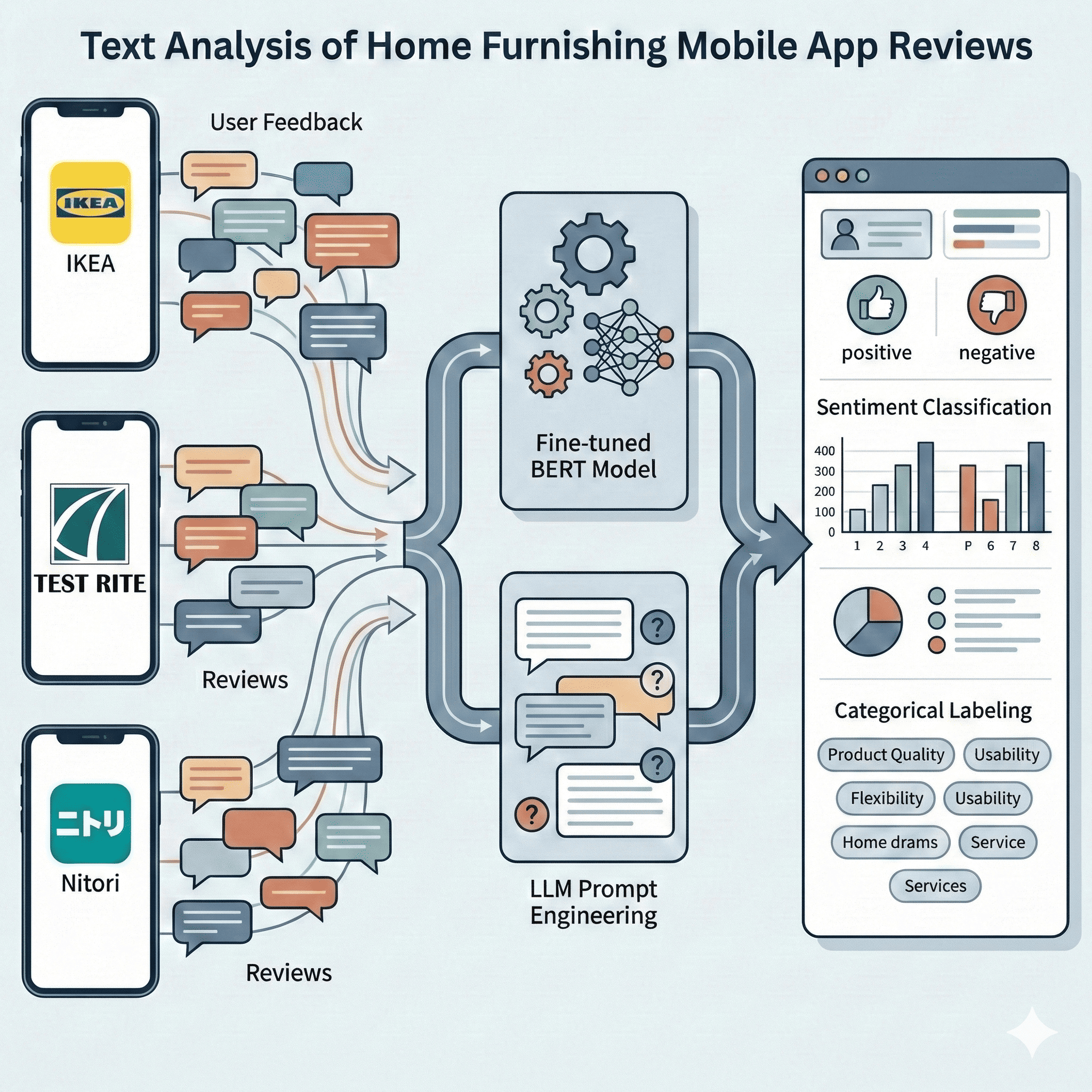 Enhancing Home Furnishing App Usability: A Text Mining Approach Using BERT and Large Language Models國際研討會論文本研究針對 IKEA、特力屋(Test Rite)及宜得利(Nitori)三大家居品牌 App,運用文字探勘技術,比較「微調 BERT 模型」與「大型語言模型(LLM)提示工程」在情感分類與標註上的成效。本研究建立一套自動化評估框架,協助業者從大規模反饋中快速提取洞察,以優化 App 功能並提升使用者體驗。https://ieeexplore.ieee.org/document/11159395Gemini_Generated_Image_fiz95qfiz95qfiz9.png