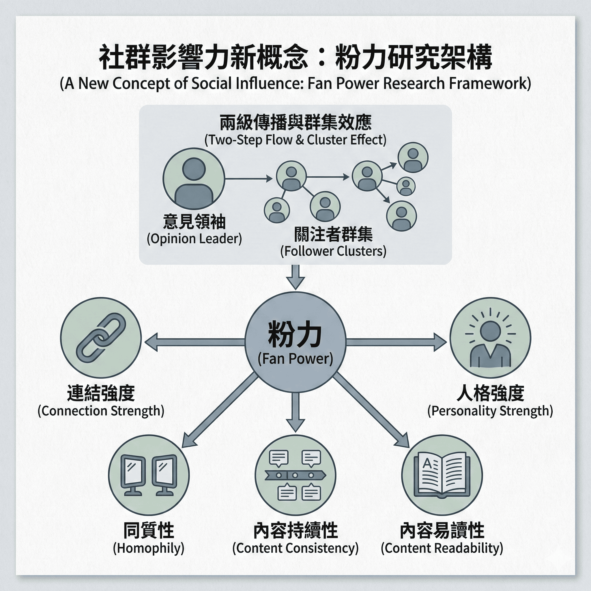 個人社群影響力量表之建構碩士論文本研究基於兩級傳播理論,針對社群意見領袖提出新概念「粉力」。透過訪談與 300 份問卷調查,開發出一份具備良好信效度的量表,包含連結強度、同質性、內容持續性、內容易讀性、人格強度等五大構面(共 21 題)。此研究成果建構了個人社群影響力的評估工具,可作為行銷人員篩選合作對象的具體準則。https://ndltd.ncl.edu.tw/cgi-bin/gs32/gsweb.cgi/ccd=jC133y/record?r1=2&h1=1Gemini_Generated_Image_9cqny29cqny29cqn.png