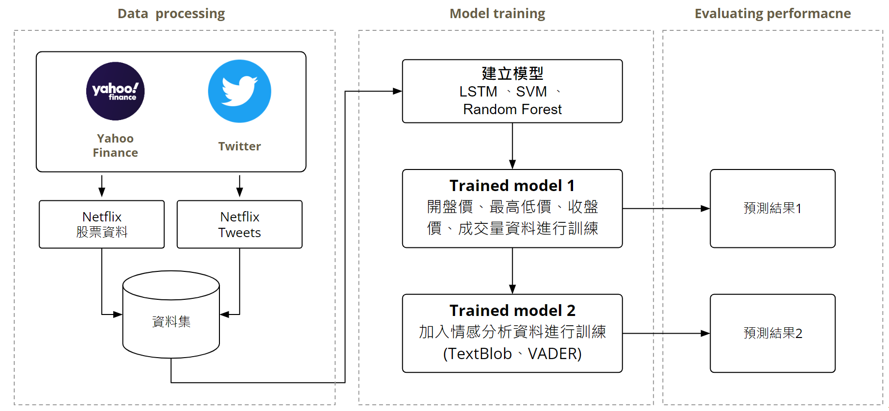 Twitter 情緒分析模型預測 Netflix 股價變動此專案是研究 Twitter 上有關Netflix的推文,進行情感分析和情感分類,並結合股市數據,透過機器學習建立預測股票波動模型。